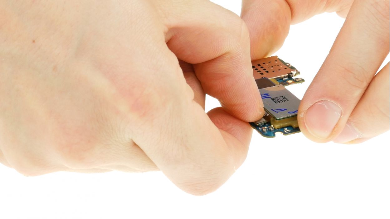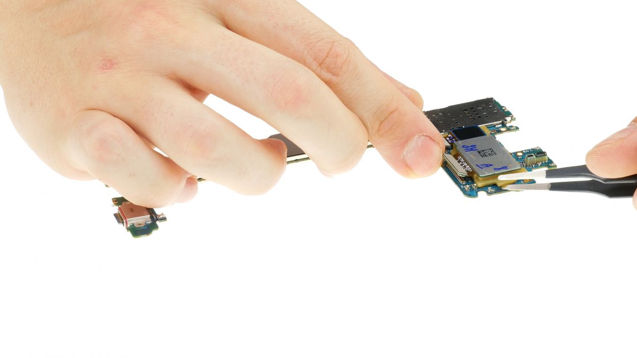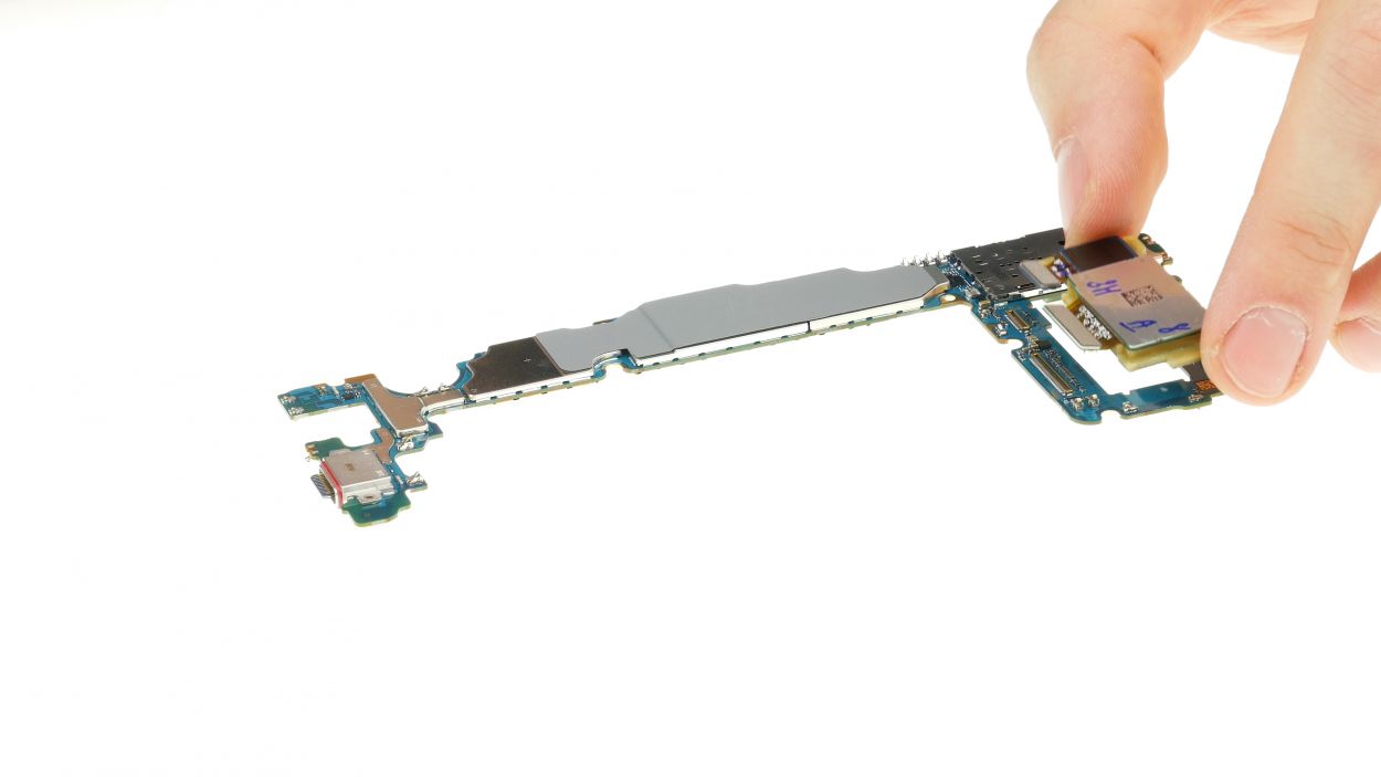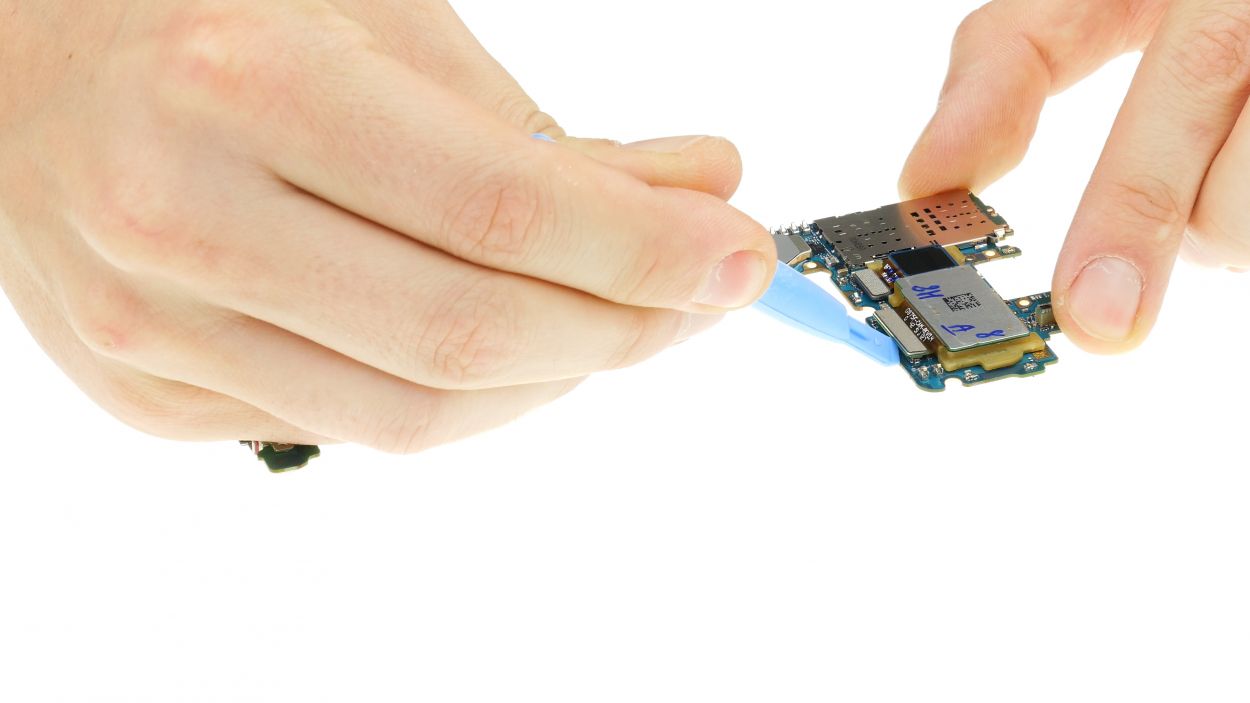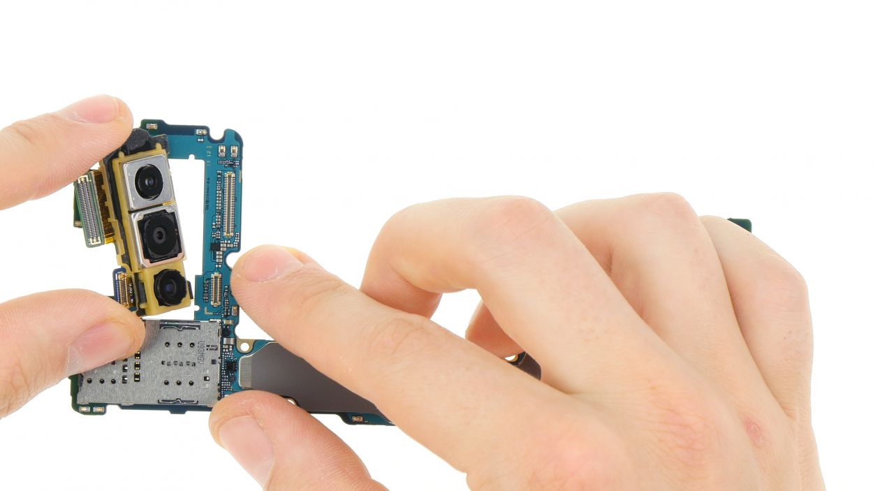 – Next up, with a steady hand, use a pair of tweezers to delicately lift the rear camera out of its snug little home on the mainboard. You’ve got this!